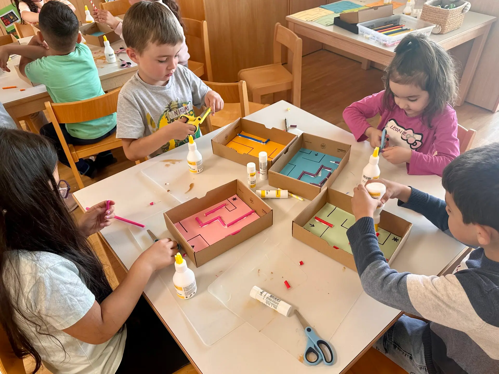 Besonders beliebt waren die Rollenspiele, bei denen Kinder gemeinsam Geschichten entwickelten und in verschiedene Rollen schlüpften. Gesellschaftsspiele und Reisespiele wurden nicht nur gespielt, sondern auch selbst hergestellt – eine tolle Möglichkeit, eigene Ideen umzusetzen. Draussen wurde ebenfalls viel gelacht und getobt: Bei verschiedenen Sport- und Bewegungsspielen auf dem Schulhof, der Turnhalle und im St. Margrethener Wald stand der Spass an der frischen Luft im Vordergrund.