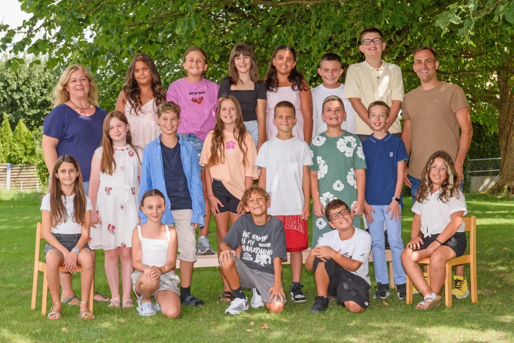 Klassenfoto mit TT-Lehrperson Alexandra Müller und Louise Kobierski (Werken)